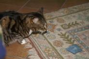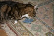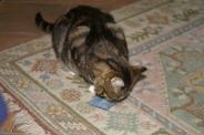 Samstag Morgen, 09.00h - Die Minzekissen werden an verschiedenen Orten wieder ausgelegt und erfreuen sich unterschiedlicher Aufmerksamkeit. Durch besondere Brutalität hervor tut sich Juli, der sofort wieder sein wildes Spiel mit der Minze-Maus beginnt.