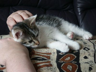 Im August 2007 entdeckten wir im Garten diese kleine schwarze Schönheit. Sie schien zu niemandem zu gehören, hatte aber offensichtlich den festen Vorsatz, uns zu adoptieren. Das hat inzwischen vorzüglich geklappt - seit Oktober 2007 teilt Miezi mit uns allen Freßnapf und Bett und ist der einzige Freigänger unserer Bande.